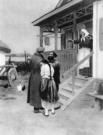 在通往鞑靼村去的山坡斜路上,他困惑不解地发现自己手里还握着鞭子,于是扔掉鞭子,阔步在村里的胡同里走着。家家户户的小窗户上,都挤满了由于他的归来大感惊异的面孔,迎面走来,认出他的妇女都深深地向他鞠躬行礼。