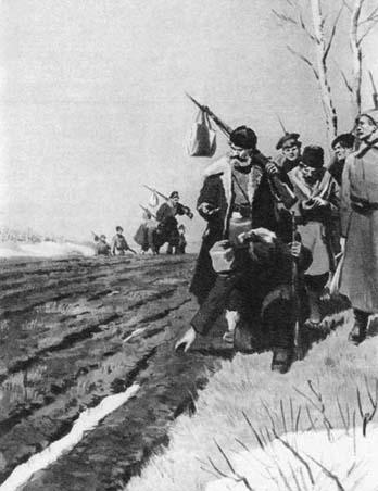 吃过午饭以后,决定在舒服的、像葡萄酒一样醉人的春日的艳阳天里打个盹儿。大家都趴在沙土地上,叫太阳晒着脊背,打了一会儿呼噜,然后就又顺着褐色的草原,踏着去年的庄稼茬子,不走大道,一直往前走。他们穿着短上衣、军大衣、粗呢农民上衣和光面短皮袄;有的穿着靴子,有的穿鞋,裤筒掖在白袜筒里,有人脚上什么也没有穿。干粮袋在刺刀上摇晃。