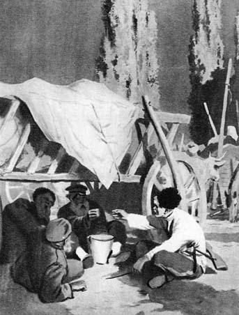 普罗霍尔又回到难民的大车队那里。烧树枝、倒塌的篱笆和干牲口粪的火堆的苦烟,被小风一吹,弥漫在连绵不断、无头无尾的野营上空:婆娘们正在做早饭。